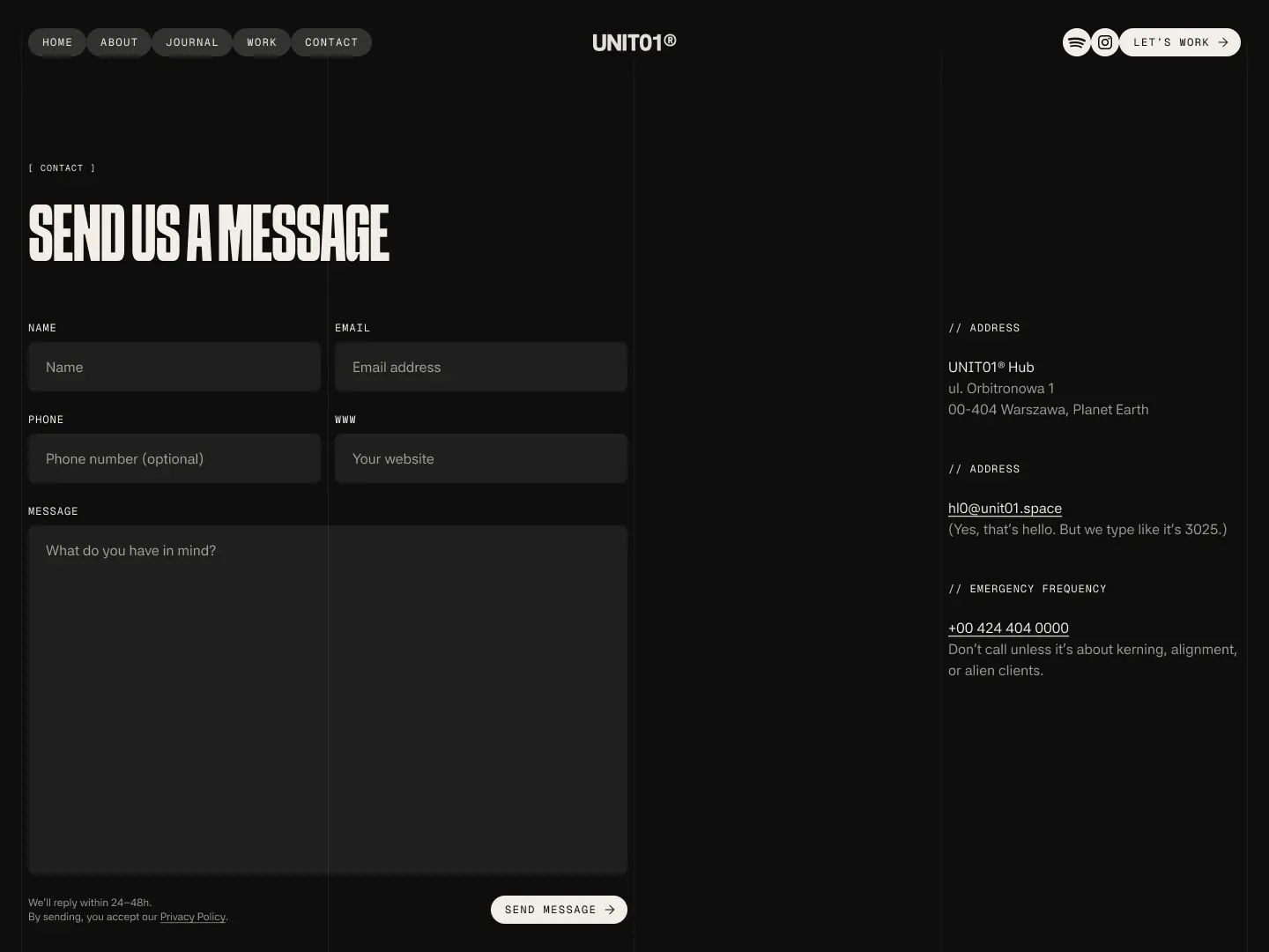 At UNIT01®, we treat layout like spaceship engineering: every component must hold its own weight in orbit. Whether it’s a hero section or microcopy in the footer, it all contributes to navigational flow. Good design isn’t just hierarchy and aesthetics — it’s physics. Because when gravity feels right, users don’t even notice it. But when it’s missing? They drift. And that’s the fastest way to lose them in space.
